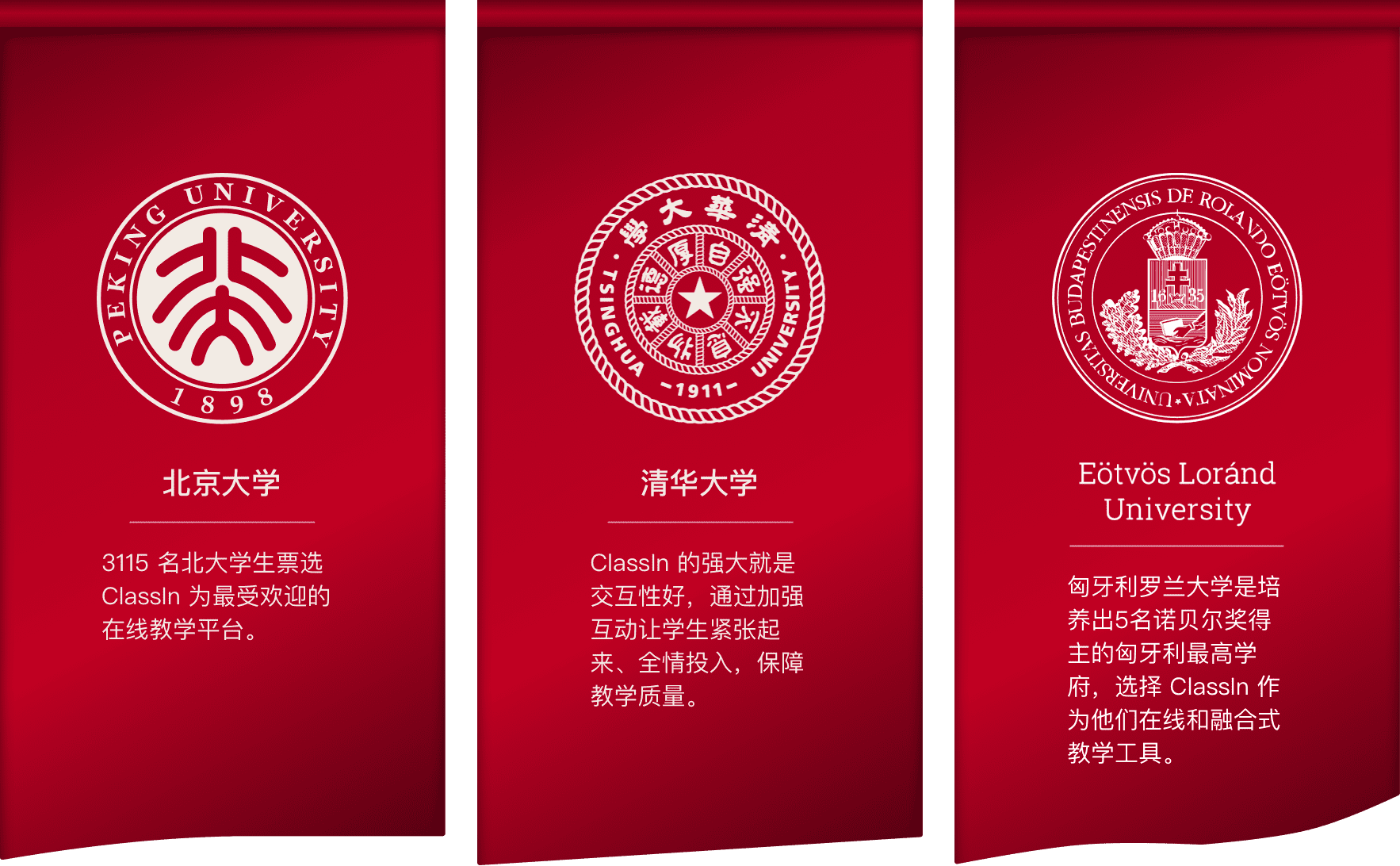 北京大学线上学习空间:2613门本科生课程和1824门研究生课程,从通识课、研讨课、选修课等各类教学形态,80%的老师选择 ClassIn 直播的教学方式。在特色选修课《全球同上一堂课》项目中,北京大学使用 ClassIn 汇集全球名师和30多个国家和地区的学生共同上课,实现让不同地区的学生相互交流、共同学习、共同促进。