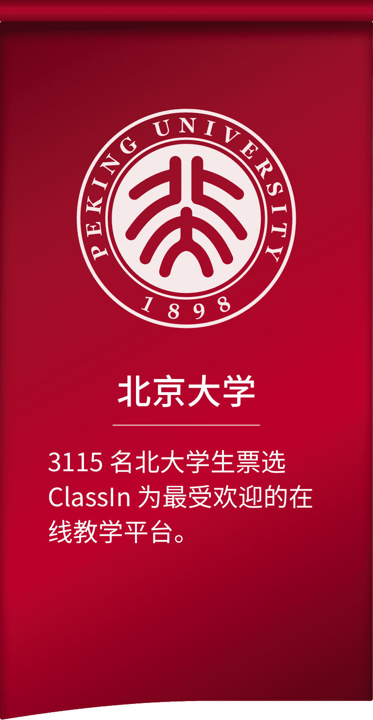 北京大学线上学习空间:2613门本科生课程 和1824门研究生课程,从通识课、研讨课、 选修课等各类教学形态,80%的老师选择 ClassIn 直播的教学方式。在特色选修课《全 球同上一堂课》项目中,北京大学使用 ClassIn 汇集全球名师和30多个国家和地区的 学生共同上课,实现让不同地区的学生相互 交流、共同学习、共同促进。